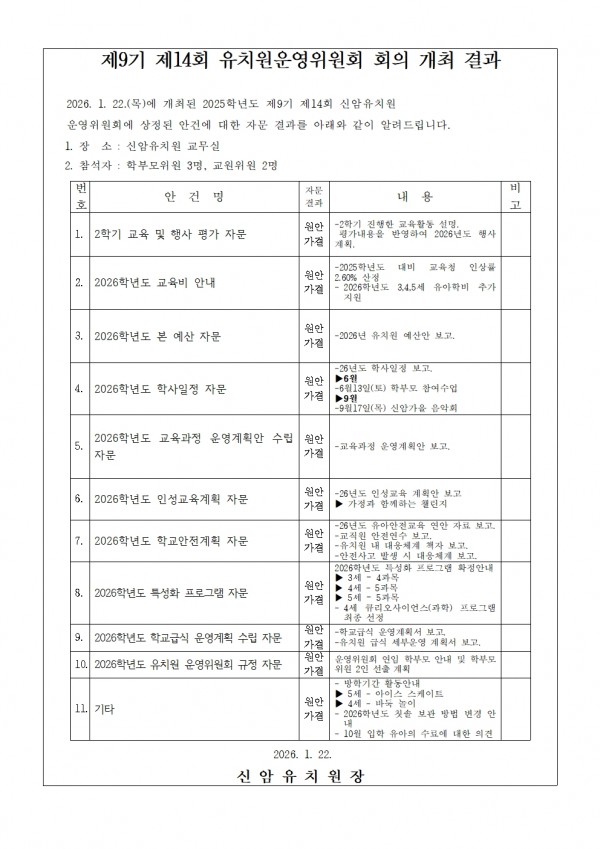 제 9기 14회 신암유치원 운영위원회 임시회 결과 안내입니다. 페이지 정보 작성자 신암유치원 댓글 0건 조회 17회 작성일 26-01-23 14:09 목록 본문 제 9기 14회 신암유치원 운영위원회 임시회 결과 안내입니다. 다음글제 9기 제 14회 신암유치원 운영위원회를 앞두고 소집공고를 올립니다 26.01.21