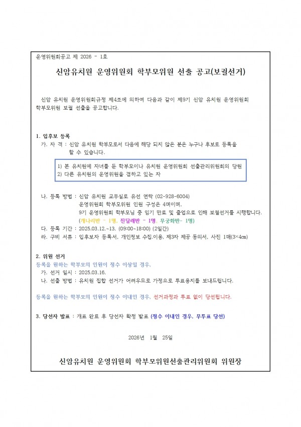 2026학년도 9기 신암유치원 운영위원회 학부모위원 선출공고(보궐선거) 페이지 정보 작성자 신암유치원 댓글 0건 조회 50회 작성일 26-03-31 17:02 목록 본문 안녕하십니까! 신암유치원입니다. 이전글제 9기 제 14회 신암유치원 운영위원회를 앞두고 소집공고를 올립니다 26.04.15 다음글제 9기 13회 신암유치원 운영위원회 임시회 회의록 입니다. 26.03.24