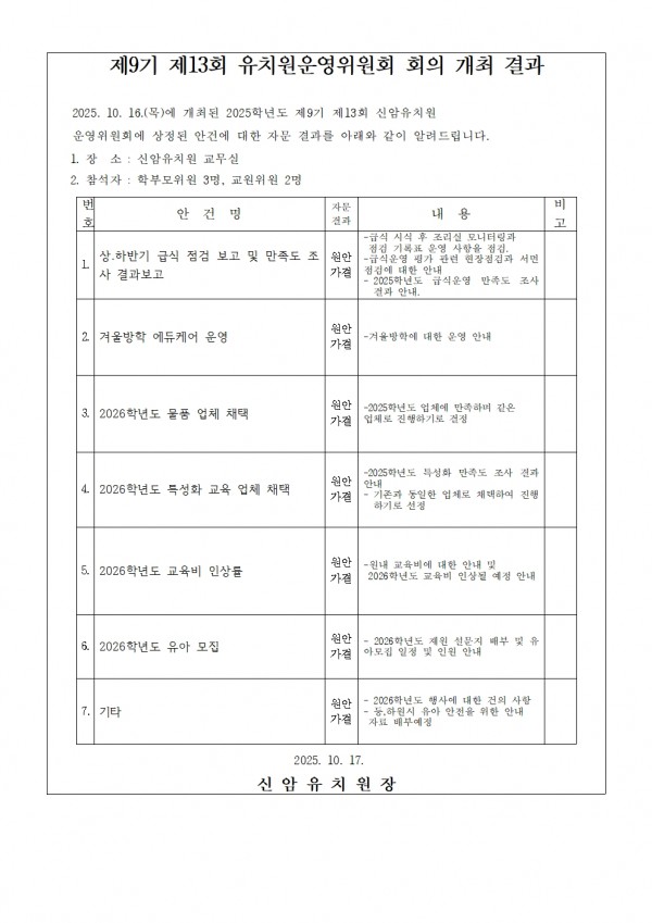 제 9기 13회 신암유치원 운영위원회 임시회 결과 안내입니다. 페이지 정보 작성자 신암유치원 댓글 0건 조회 1회 작성일 25-10-17 14:07 목록 본문 제 9기 13회 신암유치원 운영위원회 임시회 결과 안내입니다. 다음글제 9기 제 12회 신암유치원 운영위원회를 앞두고 소집공고를 올립니다. 25.09.18