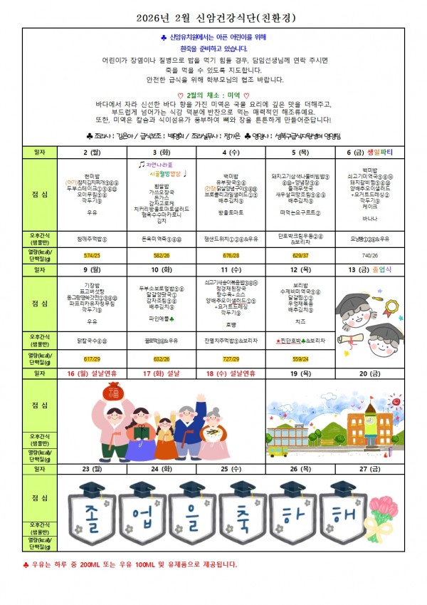 무궁화반 2월 식단입니다. 페이지 정보 작성자 신암유치원 댓글 0건 조회 164회 작성일 26-02-02 16:11 목록 본문 무궁화반 2월 식단입니다. 이전글2월 2일 26.02.02 다음글개나리반 진달래반 2월 식단입니다. 26.02.02 댓글 0 댓글목록 등록된 댓글이 없습니다.
